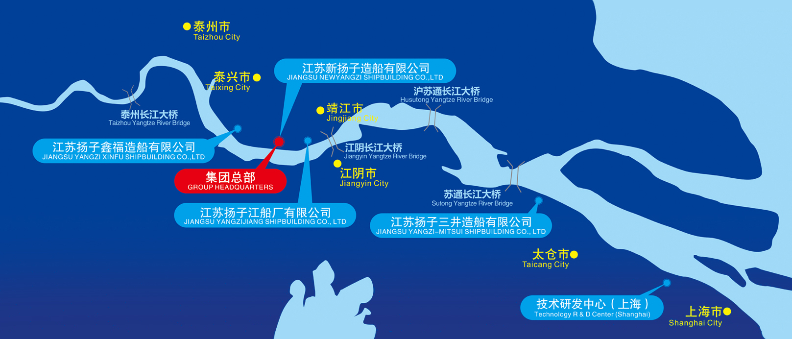 集團(tuán)公司下轄江蘇新?lián)P子造船有限公司、江蘇揚(yáng)子鑫福造船有限公司、江蘇揚(yáng)子三井造船有限公司及江蘇揚(yáng)子江船廠有限公司4家造船企業(yè),分布于長江下游江蘇省境內(nèi)的靖江市、泰興市和太倉市的黃金水道兩岸,距上海、南京兩大城市均170公里。