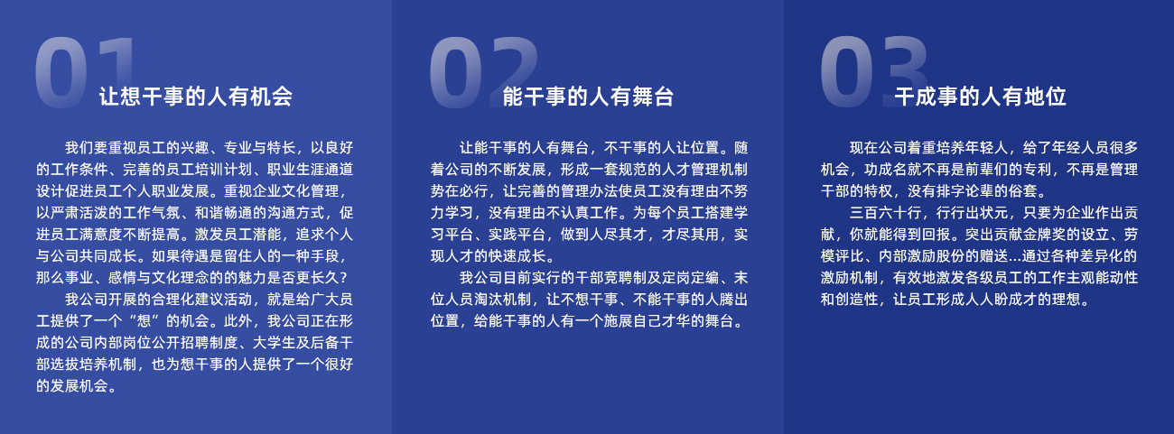 “運(yùn)籌帷幄之中,決勝于千里之外,吾不如子房;安國(guó)家,撫百姓、給餉銀,不絕糧道,吾不如蕭何;統(tǒng)百萬之軍,戰(zhàn)必勝,攻必取,吾不如韓信。此三者,皆人杰也。吾能用之,所以取天下也!”出色的員工才會(huì)讓企業(yè)更卓越。我們要打破資歷、年齡、學(xué)歷、性別、地域的界限,形成不拘一格,人盡其才的用人局面。