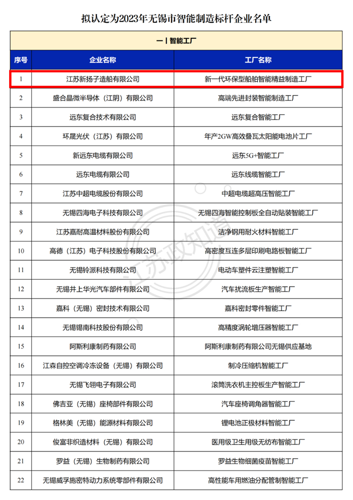 我集團江蘇新?lián)P子造船有限公司被認定為“2023年無錫市智能制造標桿企業(yè)”。