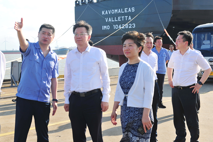 調(diào)研中,李忠軍副省長一行深入公司生產(chǎn)一線,只見一艘艘成型的新船正在水下作舾裝調(diào)試,船塢內(nèi)各類船舶正在加緊建造,一派繁忙的船舶建造場景。在座談會上,李忠軍副省長詳細(xì)了解我司運行情況,詢問地緣政治、貿(mào)易戰(zhàn)等帶來的影響、未來航運市場變化分析以及企業(yè)的應(yīng)對舉措,勉勵企業(yè)按照新質(zhì)生產(chǎn)力發(fā)展要求,加快高端化、智能化、綠色化步伐,加快智改數(shù)轉(zhuǎn)網(wǎng)聯(lián),不斷提升船舶研發(fā)能力和建造水平,進(jìn)一步增強江蘇高技術(shù)船舶與海工裝備先進(jìn)制造業(yè)集群的國際競爭力。