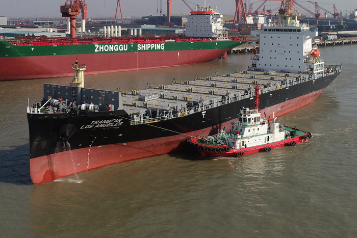 揚(yáng)子長博為致遠(yuǎn)航運(yùn)建造的1800TEU集裝箱船“TRANSFAR LOS ANGELES”輪交付離廠