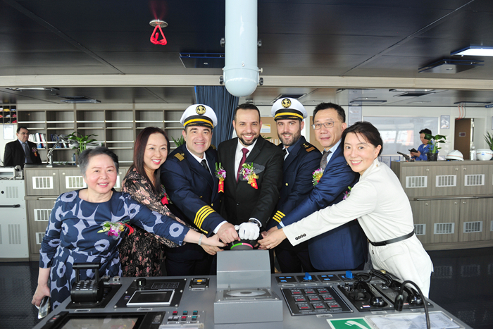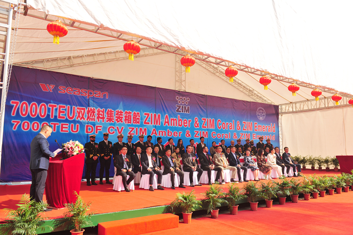 命名人Ana Ang女士、Sally Cheung女士、Cindy Li 女士,SEASPAN首席商務(wù)官李堃先生,ZIM亞洲區(qū)副總裁Metanes Abdallah先生,挪威船級社(DNV)高級副總裁黃今先生,中國船舶及海洋工程設(shè)計研究院(MARIC)副所長朱建璋先生,法國巴黎銀行出口信貸助理副總裁江琛女士,中國出口信用保險公司江蘇分公司項目險業(yè)務(wù)處副處長馬振先生,我集團(tuán)董事長任樂天先生,集團(tuán)副總經(jīng)理兼新?lián)P子造船總經(jīng)理杜成忠先生、集團(tuán)副總經(jīng)理周科偉先生,集團(tuán)總經(jīng)理助理吉宏飛先生,以及船東監(jiān)造組、項目合作相關(guān)方等領(lǐng)導(dǎo)和嘉賓出席了儀式。