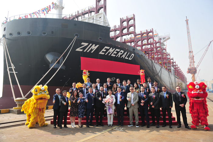 Cindy Li 女士將N1371船命名為“ZIM EMERALD”輪。嘉賓們共同與新船合影留念,祝福新船在未來的每一次航程中,順風(fēng)順?biāo)?,為船員帶來平安,為船東和合作各方帶來財富和榮耀。