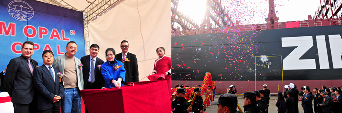 蔡霞女士將新船命名為“ZIM OPAL”輪,為新船砍纜并擲香檳禮,拉響汽笛,祝福新船、隨船船員航行平安,為船東和租家?guī)順s譽和財富。在“ZIM OPAL”輪首任船長的陪同下,參加儀式的嘉賓興致勃勃地登船參觀。
