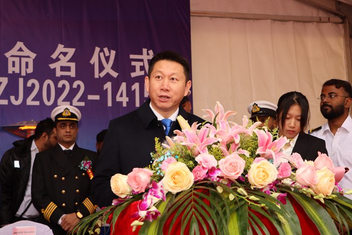 宋書明先生代表船廠致辭,他表示:“該首制船含春節(jié)建造周期約10個(gè)月,在此過程中,船東、船級社和船廠都致力于建造一艘優(yōu)質(zhì)高性能船舶,堅(jiān)信在各方的共同努力下,后續(xù)系列船舶會有更出色的表現(xiàn)。今天,終于迎來為該船命名的重要時(shí)刻。感謝船東現(xiàn)場團(tuán)隊(duì)和DNV驗(yàn)船師的支持和幫助以及參與該船建造的揚(yáng)子三井造船員工的不懈努力。讓我們繼續(xù)與船東和船級社緊密合作,為建造更安全、更環(huán)保、更具國際競爭力的船舶而努力。我們將按照船東和全球市場的需求,用心打造每一艘船?!?/p>