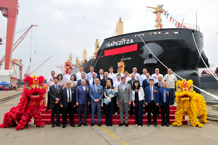 5月30日,我集團(tuán)與NAVIBULGAR船東共同為新船舉行了隆重的命名交船儀式。命名人Dani Domuschieva女士,NAVIBULGAR董事長(zhǎng)Georgi Domuschiev先生,NAVIBULGAR執(zhí)行董事Alexander Kalchev先生,DNV船級(jí)社江陰站經(jīng)理史勇林先生,克拉克森新造船經(jīng)理朱宏巍先生,我集團(tuán)董事長(zhǎng)任樂天先生、集團(tuán)副總經(jīng)理吉宏飛先生,以及船東監(jiān)造組、船檢、船廠相關(guān)人員代表及嘉賓出席了儀式。