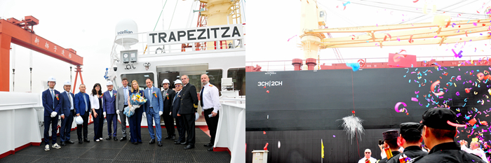 Dani Domuschieva女士將新船命名為“TRAPEZITZA”輪,并擲香檳禮。鞭炮、禮花齊響,汽笛共鳴,龍獅共舞。祝福新船、隨船船員航行平安,為建造方帶來榮譽(yù),為船東帶來好運(yùn)與財(cái)富。嘉賓們齊聚船艏合影留念,并在船長(zhǎng)的陪同下登船參觀。