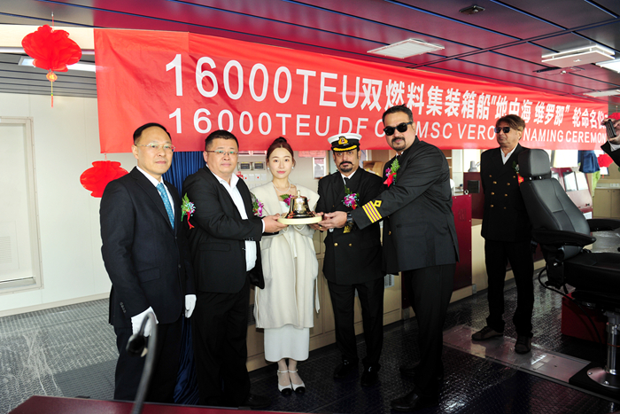 命名人陳澤藝女士將新船命名為“MSC VERONA”輪,為新船砍纜、擲香檳禮、拉響汽笛,并與船長共同在新船畫框上署名留念,祝福隨船船員航行平安,為船東帶來榮譽和財富。