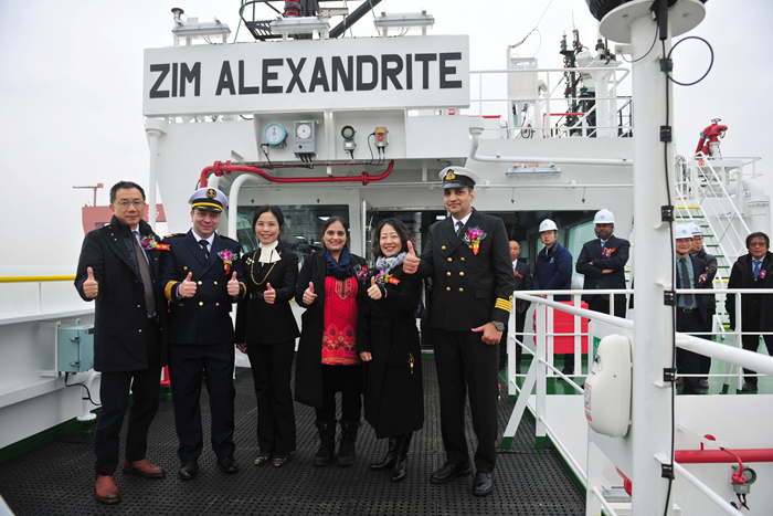 Tracy Hui女士將新船命名為“ZIM ALEXANDRITE”輪,為新船砍纜、擲香檳禮并與嘉賓們登船參觀。汽笛鳴響,祝福新船以及隨船船員航行平安,為船東和租家?guī)順s譽(yù)和財(cái)富。