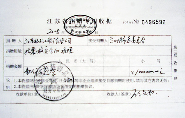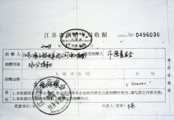 2008年5月,集團(tuán)公司向四川汶川災(zāi)區(qū)捐建學(xué)校計(jì)1000萬(wàn)元,集團(tuán)員工向四川災(zāi)區(qū)捐款30萬(wàn)元人民幣。(附1000萬(wàn)捐款憑證及員工捐款30萬(wàn)憑證)