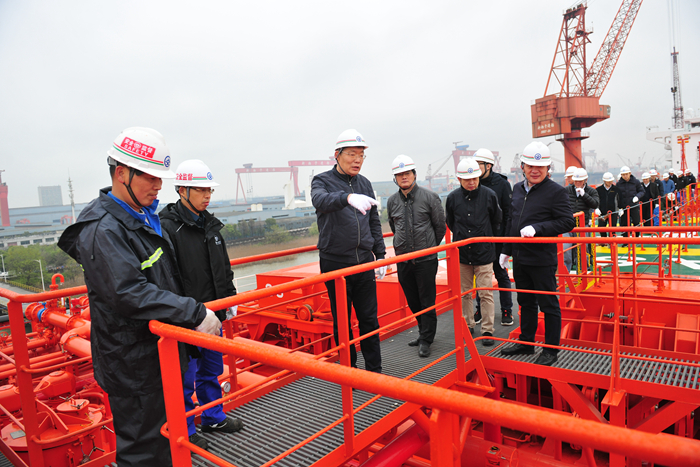 Mr. Wang Jiansheng, the Group’s Vice Chairman, Mr.Du Chengzhong, Deputy General Manager and the person in charge of the production department accompanied the Jiangnan Shipbuilding Research Group to visit the production sites of Yangzi Xinfu and NYZ respectively. When visiting the 83500DWT Cleanbu Carrier built by NYZ, Chairman Lin spoke highly of the design concept of this special ship type which can carry oil, bulk cargo and chemical products and provide flexible operation strategy for shipowners.
